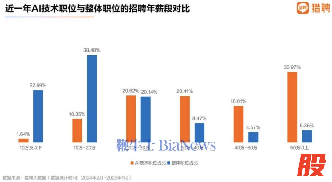 从企业角度看,这是行业走向竞争深水区的必然。猎聘大数据研究院发布的《2025AI技术人才供需洞察报告》显示,在AI类岗位中,年薪50万元以上的岗位占比最高,达30.9%,而在整体职位中,年薪50万元以上的仅占5.36%。